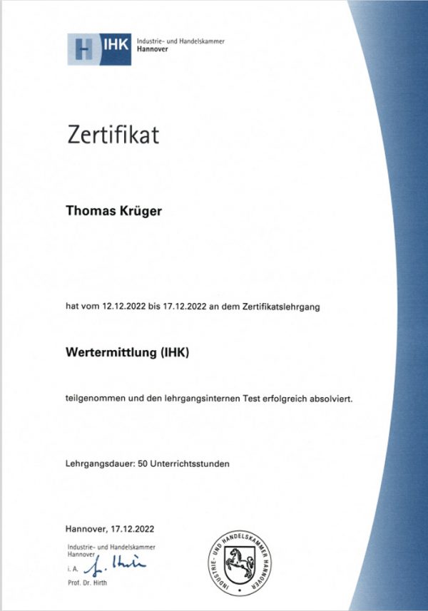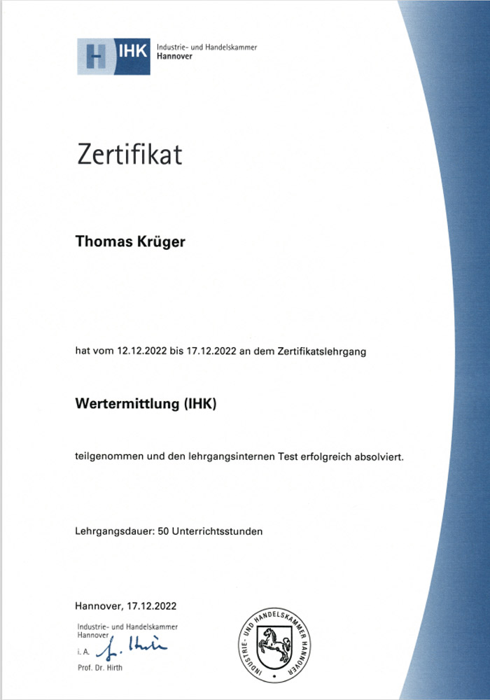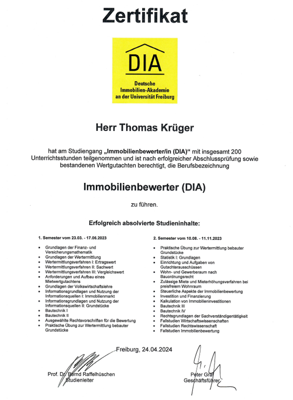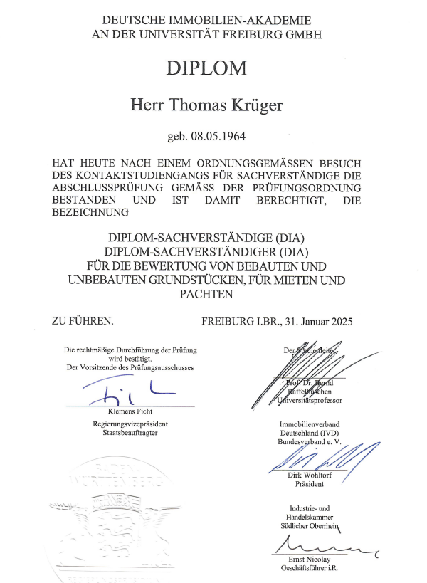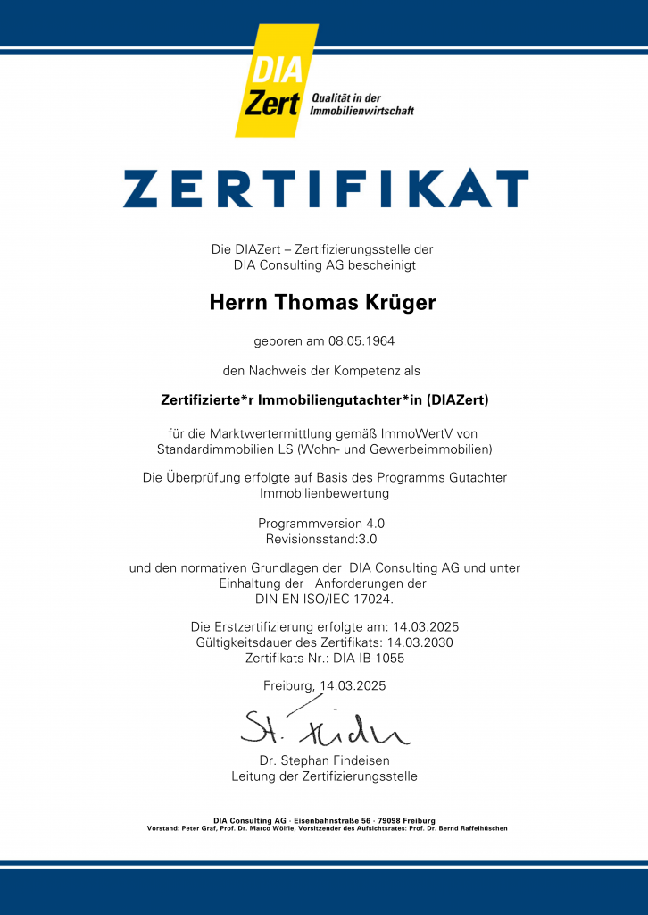 Thomas Krüger ist zertifizierter Immobiliengutachter DIAZert für die Marktwertermittlung von Standardimmobilien LS (Wohn- und Gewerbeimmobilien, zertifiziert nach den normativen Grundlagen der DIA-Consulting AG unter Einhaltung der Anforderungen der DIN EN ISO / IEC 17024). Durch diese persönliche Qualifizierung profitieren vor allem Sie als Kunde von der Qualität der von Thomas Krüger erstellten Immobiliengutachten